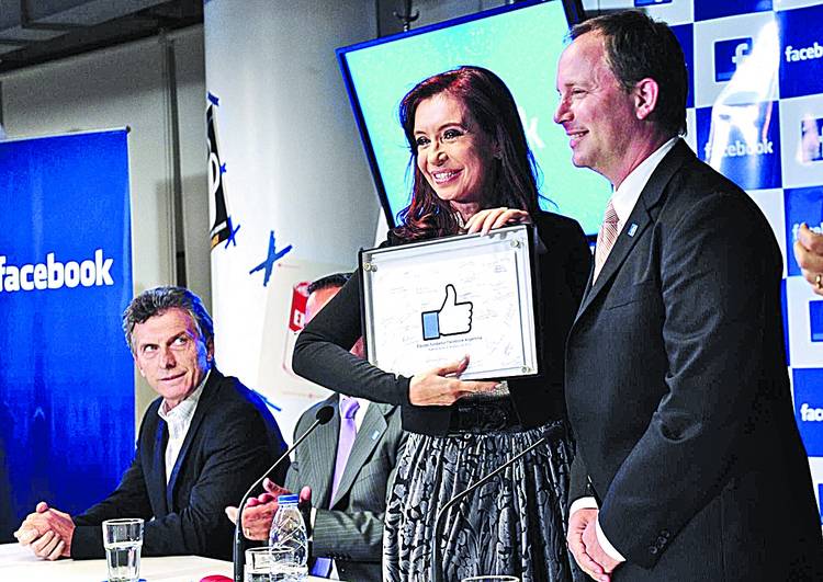 “Se viene el cambio y Facebook es parte”, escribió esperanzado Macri en el “muro”. Cristina puso: “Para Agustín [un nene que quería conocerla, y lo recibió en la Rosada) y todos los usuarios de Facebook a los que les gusta el mundo real”, y firmó #CFKArgentina. Reveló que a quienes le escriben en Facebook los ha llamado por teléfono o les contesta “a mano”. La Presidenta también dijo, como una novedad, que Facebook permitirá que los usuarios elijan su identidad sexual, aunque ya la red lo había anunciado en febrero.