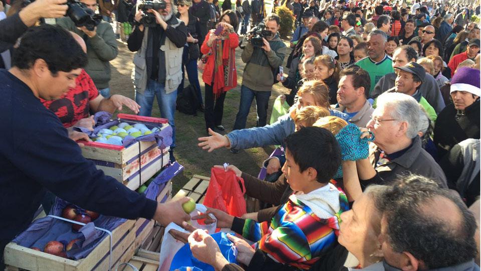 Productores del Alto Valle de Río Negro, regalan en el epicentro del país, sus cosechas, en protesta por la falta de precios para comercializar sus producciones.